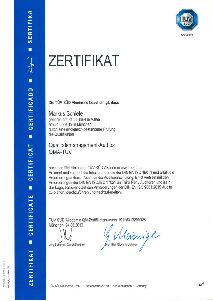 Unser Qualitätsmanagement-Beauftragter Markus Schiele hat Ende Mai 2019 eine Weiterbildung zum Qualitätsmanagement-Auditor – kurz QMA-TÜV – abgeschlossen. Dafür absolvierte er einen einwöchigen Lehrgang an der TÜV SÜD Akademie. Das Zertifikat ist Teil des Projekts von Krieger, bald auch anderen Unternehmen Beratung im QM-Bereich anzubieten. Wir gratulieren Markus Schiele zur neuen Qualifikation!